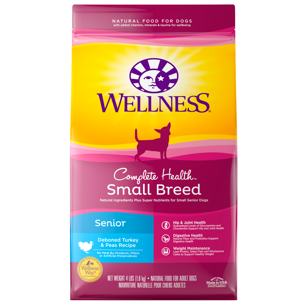 Wellness Complete Health Natural Small Breed Senior Health Recipe Dry Dog Food has a unique make up your small dog needs when they're getting older. This recipe is formulated specifically for your small breed Senior by using nutrient- dense high quality ingredients to support their unique health needs. This recipe will support your dogs heart health by suing controlled sodium levels and is packed with antioxidants from fruits and vegetables such as apples, blueberries, spinach, and sweet potatoes. Small breed Senior dogs need help maintaining lean muscle mass so Wellness uses only high quality animal protein in this recipe, such as deboned Turkey and Chicken Meal. Since it's natural for small breeds to consume less food it's super important they're getting the nutrition they need. This recipe includes a unique mix of complementary ingredients for overall wellbeing for your Senior small breed dog.